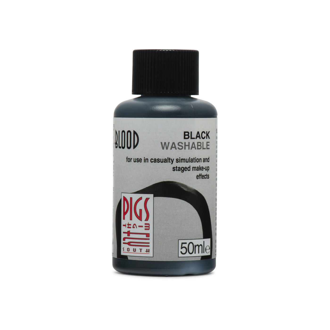 Based on the original formulation of Nick Dudman’s washable blood, this black blood has been produced by Pigs Might Fly South in response to a regular requirement for a black, non-staining blood that can be used in addition to the regular red bloods, or when filming/production calls for a much darker tone or when filming in black and white. Being a syrup-based product, the viscosity can be affected by temperature, enabling makeup artists and props teams the opportunity to alter the flow rate to suit requirements, whilst leaving the non-staining characteristics unaffected.