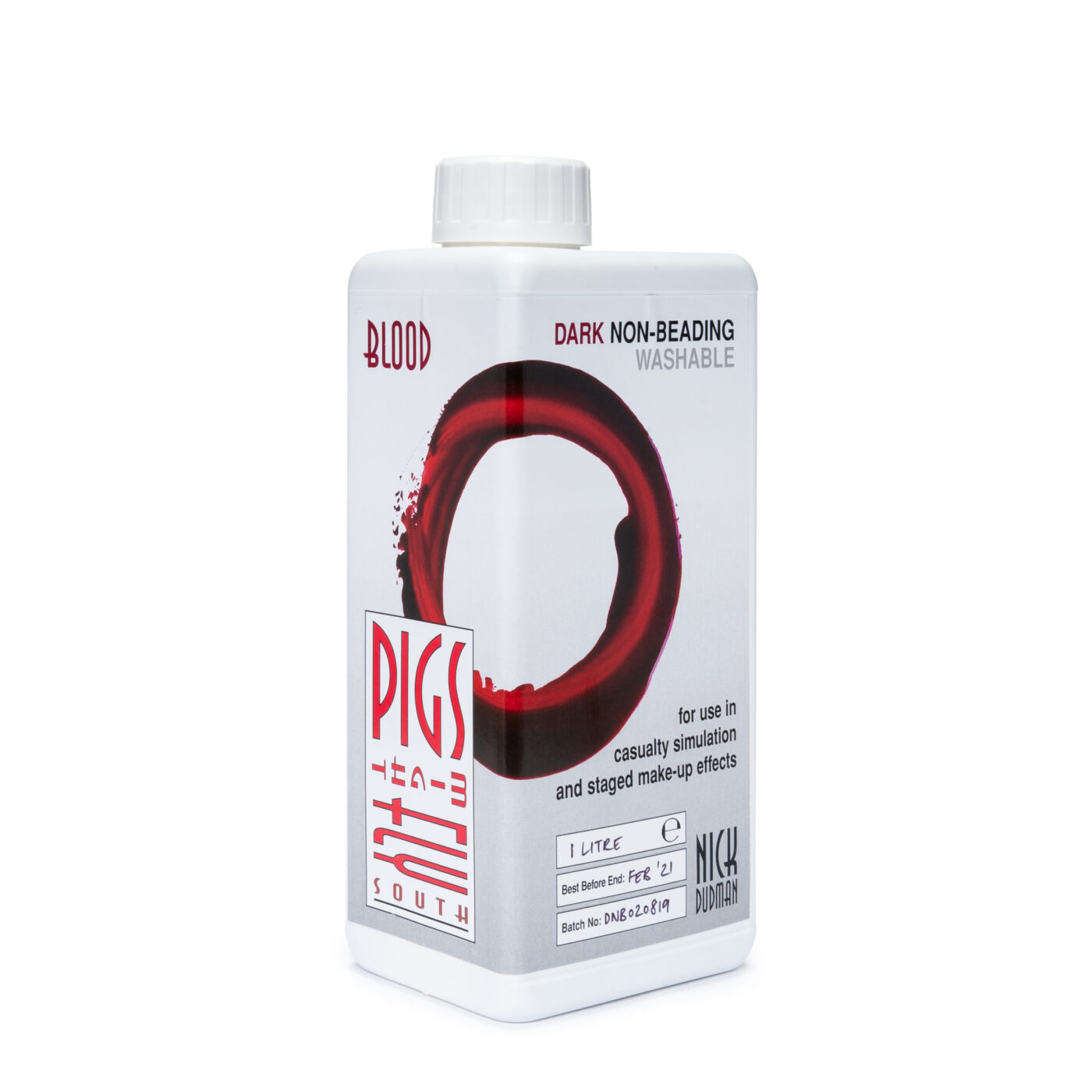 Based on the original formulation of Nick Dudman’s Dark washable blood, this ‘silicone-friendly’ blood has been produced by Pigs Might Fly South to satisfy the requirement for an ultra-realistic, non-staining blood that can be used on silicone or gelatine prosthetics without causing a beading, or droplet, effect.
