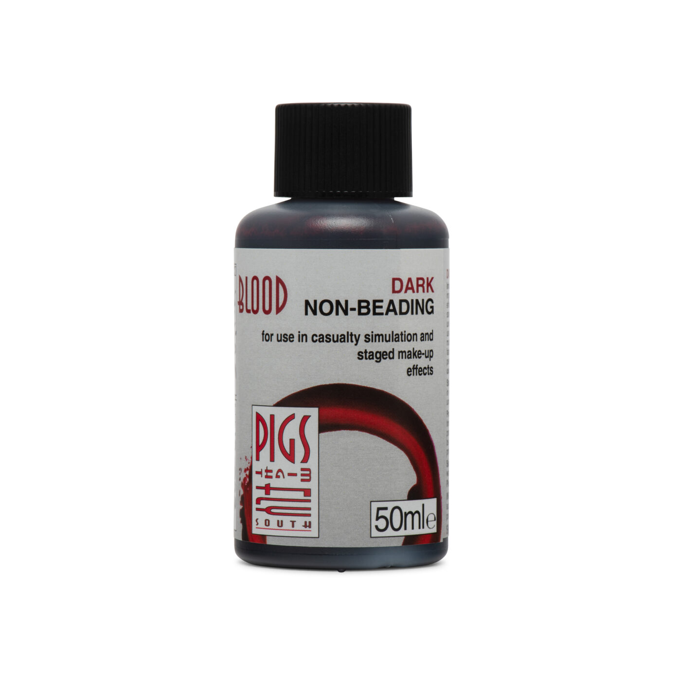 Based on the original formulation of Nick Dudman’s Dark washable blood, this ‘silicone-friendly’ blood has been produced by Pigs Might Fly South to satisfy the requirement for an ultra-realistic, non-staining blood that can be used on silicone or gelatine prosthetics without causing a beading, or droplet, effect.