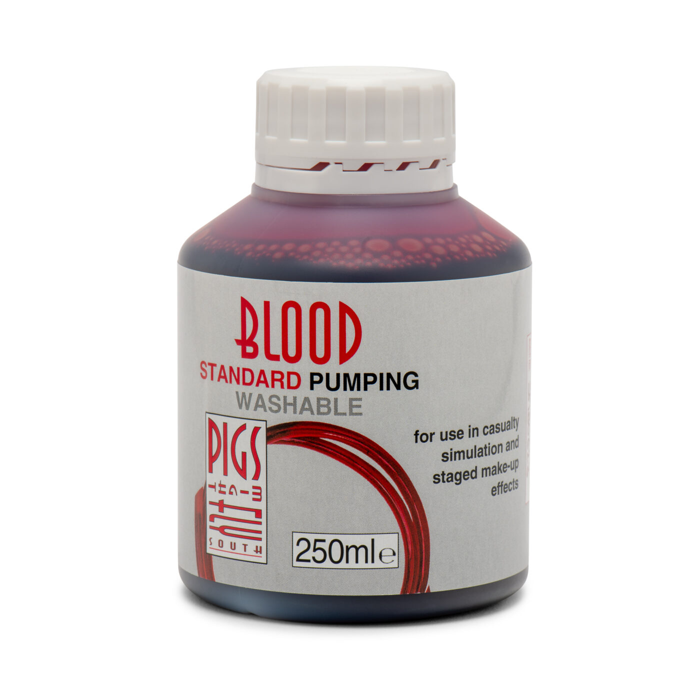 Based on the original formulation of Nick Dudman’s Standard washable blood, this artificial pumping blood, or splatter blood, has been produced by Pigs Might Fly South to satisfy the requirement for an ultra-realistic, non-staining blood that can be used in blood pumps and medical equipment, as well as being suitable for situations where large quantities of artificial blood are used to represent blood splatter. When used in blood bags/packs this artificial pumping blood will soak into costume fabrics well, as opposed to running off the fabric surface. It is less affected by temperature than the original formulation but still retains the characteristic non-staining* qualities, as well as the exceptional colour depth and accuracy of the entire range of bloods.