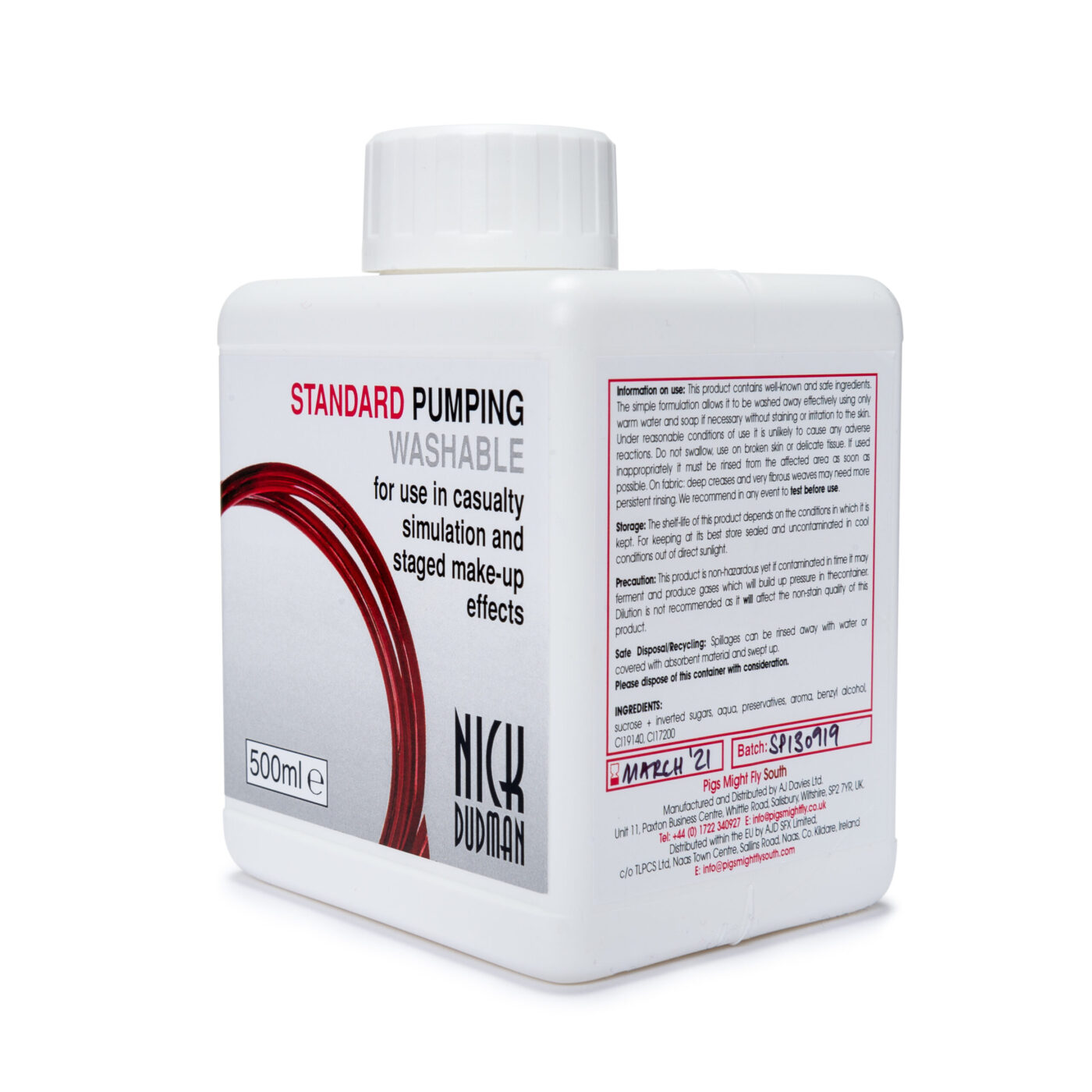 Based on the original formulation of Nick Dudman’s Standard washable blood, this artificial pumping blood, or splatter blood, has been produced by Pigs Might Fly South to satisfy the requirement for an ultra-realistic, non-staining blood that can be used in blood pumps and medical equipment, as well as being suitable for situations where large quantities of artificial blood are used to represent blood splatter. When used in blood bags/packs this artificial pumping blood will soak into costume fabrics well, as opposed to running off the fabric surface. It is less affected by temperature than the original formulation but still retains the characteristic non-staining* qualities, as well as the exceptional colour depth and accuracy of the entire range of bloods.