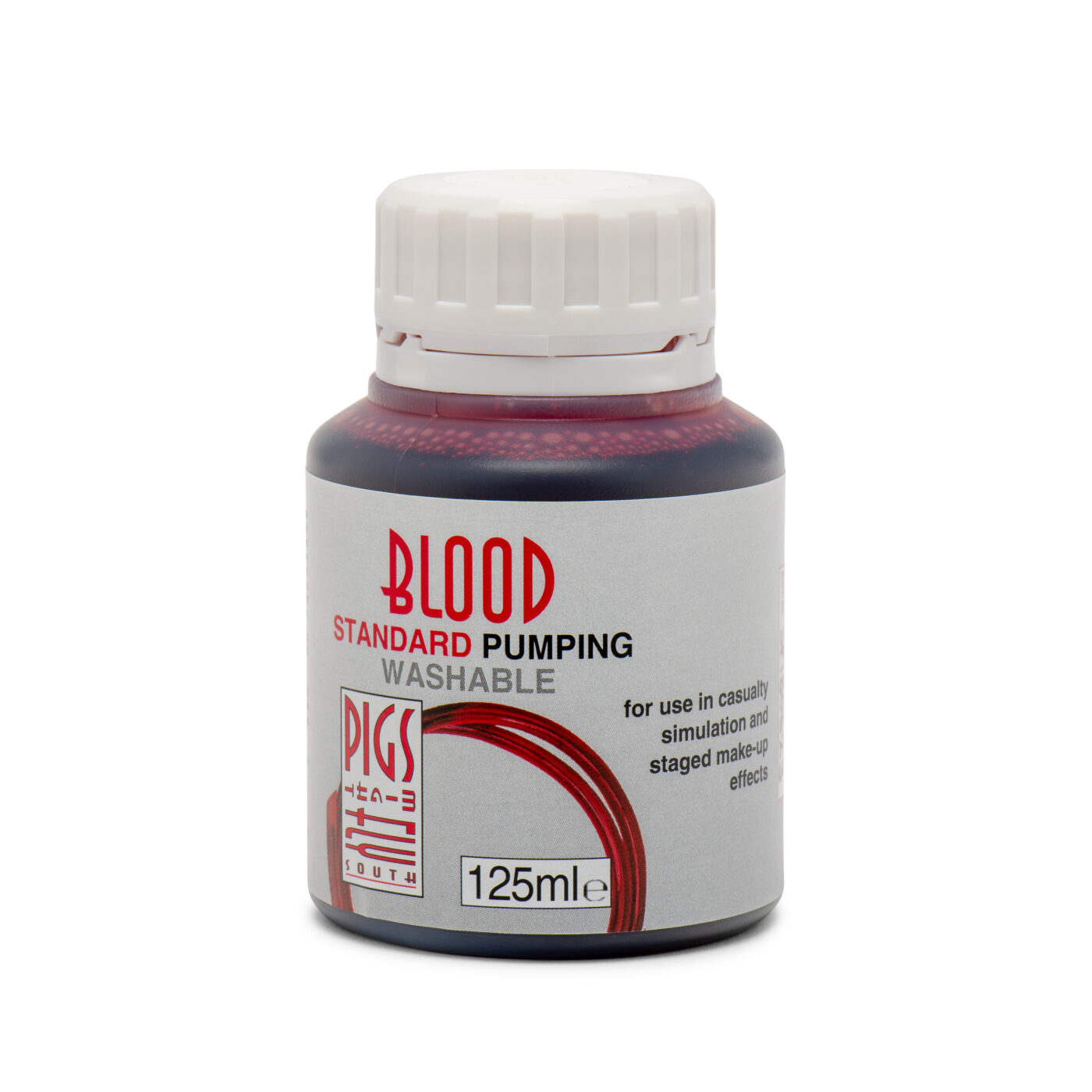 Based on the original formulation of Nick Dudman’s Standard washable blood, this artificial pumping blood, or splatter blood, has been produced by Pigs Might Fly South to satisfy the requirement for an ultra-realistic, non-staining blood that can be used in blood pumps and medical equipment, as well as being suitable for situations where large quantities of artificial blood are used to represent blood splatter. When used in blood bags/packs this artificial pumping blood will soak into costume fabrics well, as opposed to running off the fabric surface. It is less affected by temperature than the original formulation but still retains the characteristic non-staining* qualities, as well as the exceptional colour depth and accuracy of the entire range of bloods.